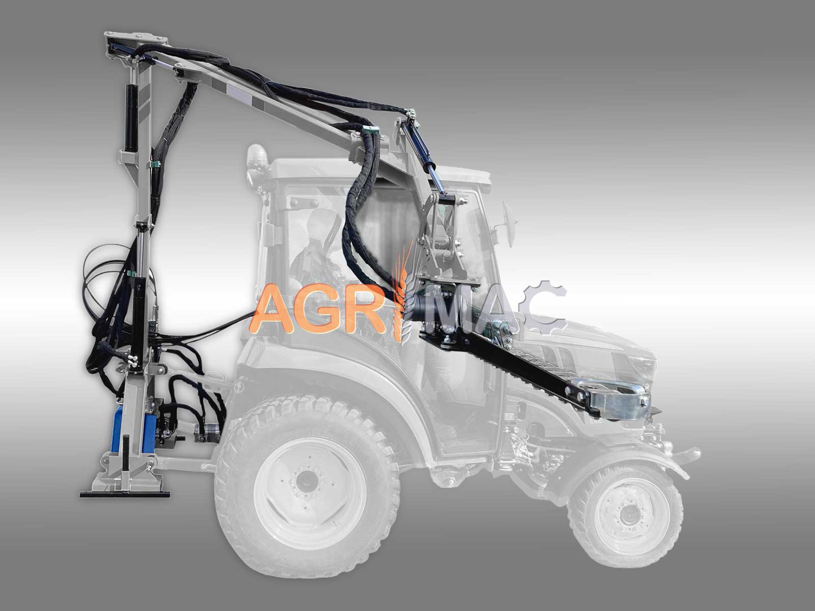 Υδραυλικό χορτοκοπτικό με μπάρα κοπής για τρακτέρ. Υδραυλικός αυτόνομος βραχίονας με λόγχη. Η κεφαλή κοπής μπορεί να κινηθεί και να προωθηθεί στην πλευρά του οδηγού.